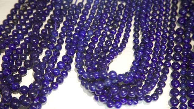 This collection of beads shows the range of lapis quality, from a pale blue with an excess of calcite or pyrite to a dark blue to violetish blue without visible calcite. Top-quality lapis can contain some pyrite. – Alan Jobbins