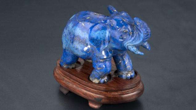 This adorable carving of a baby elephant shows off a variety of blue lapis shades. – Orasa Weldon, gift of William F. Larson
