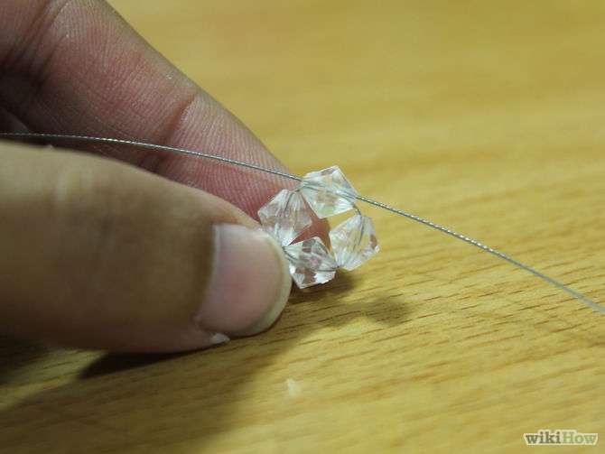 Make the first circle of the crystal necklace. Cut out a 10 centimeter (3.9 in) long nylon wire, unfold it and string 3 transparent Bicone Czech Glass Beads at the center, then cross through another transparent one and tighten the wire at last.