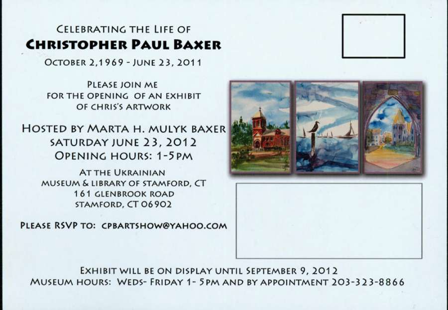 Celebrating the Life of Christopher Paul BaxerThe Ukrainian Museum and Library will display a posthumous exhibit of the art works of Christopher Baxer. Christopher and his wife Marta for the past few years have been members of the Board of Directors of our Museum and Library. Christopher, an architect by profession, was also passionately devoted to his art work, died tragically last year. His wife Marta Mulyk Baxer is hosting the exhibition of his art which will be held in the museum's gallery.