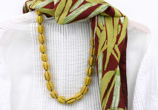 The beads of this necklace are made of ceramics, I bought them a while back because of the special shape and the beautiful yellow color of the beads. Because the beads have a little black in them, I strung small frosted black onyx beads in between the large yellow beads.
