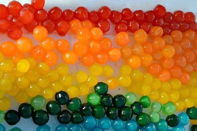 The colors are bright by themselves but for an extra fun sensory activity I wanted even brighter colors. So food colors to the rescue. I added a drop of gel food color and made a batch of rainbow boba pearls. A colorful sensory activity!